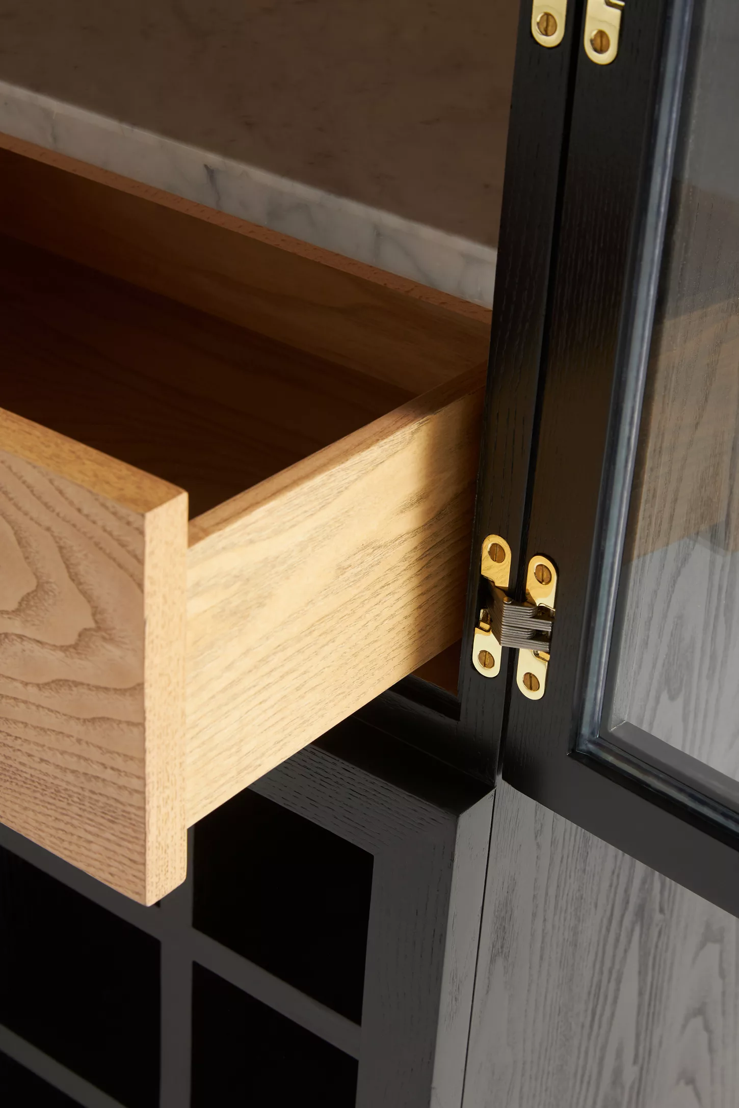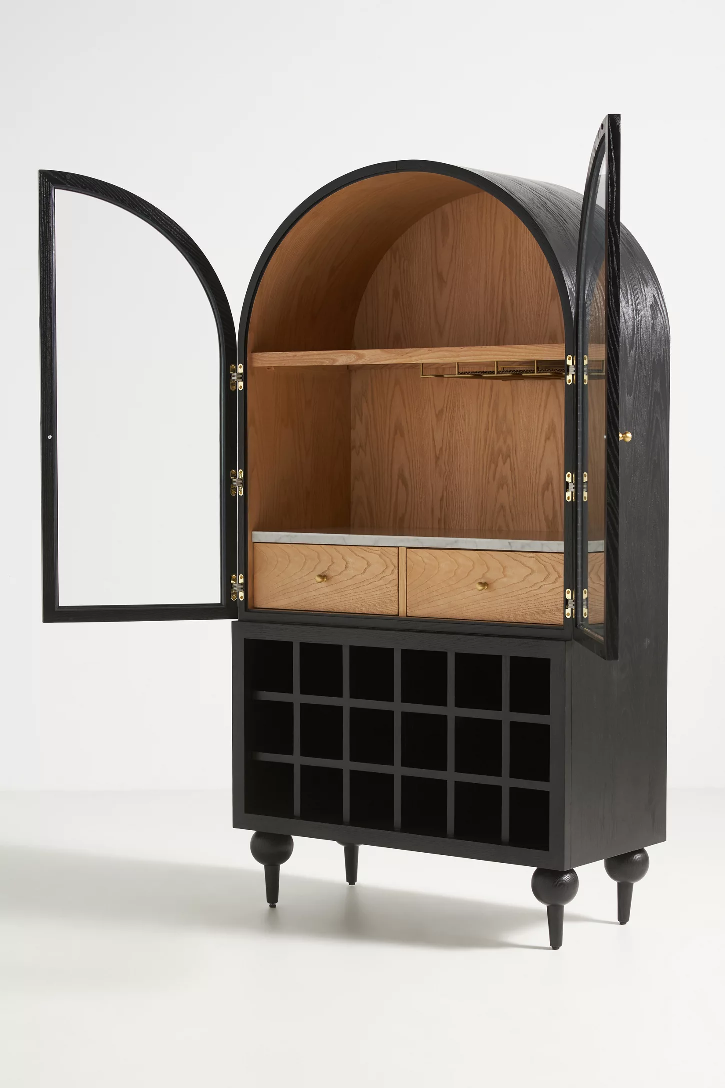 Her silence holds stories. Glasses tinkle gently like laughter behind velvet curtains. Bottles wait like secrets kept safe.