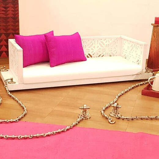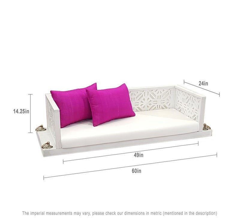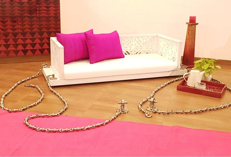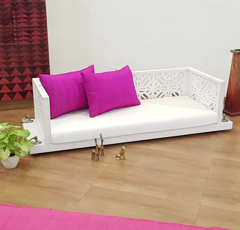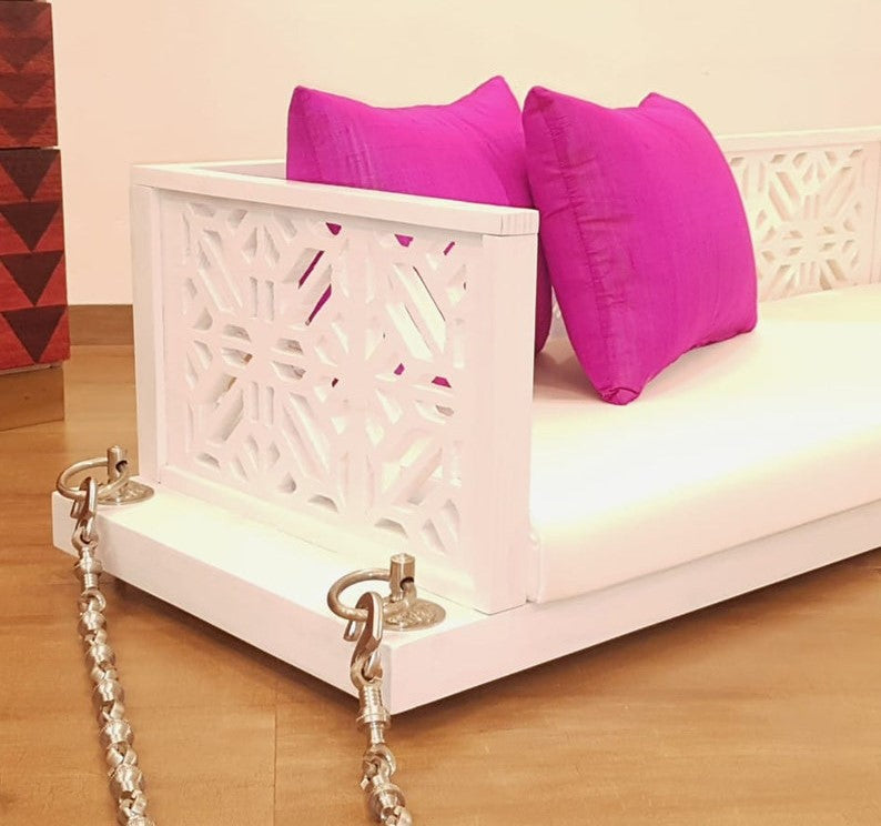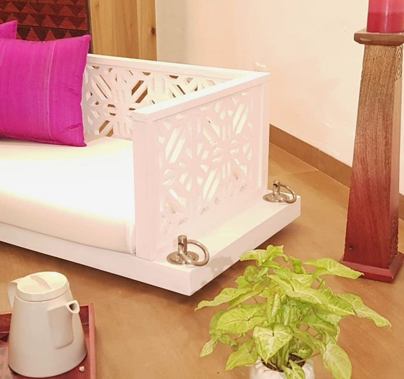 She rests now — grounded, but ready to rise. Crisp in white with hand-carved jali sides, she carries the soul of a palace jhoola and the sass of a lounge made for long, indulgent afternoons.