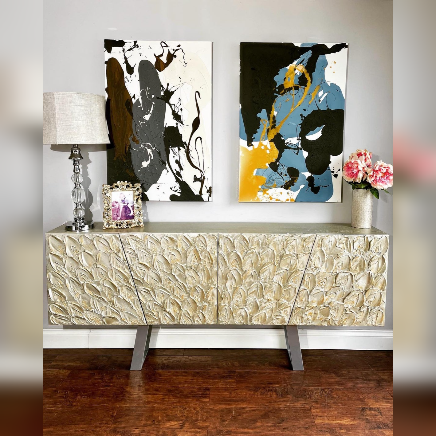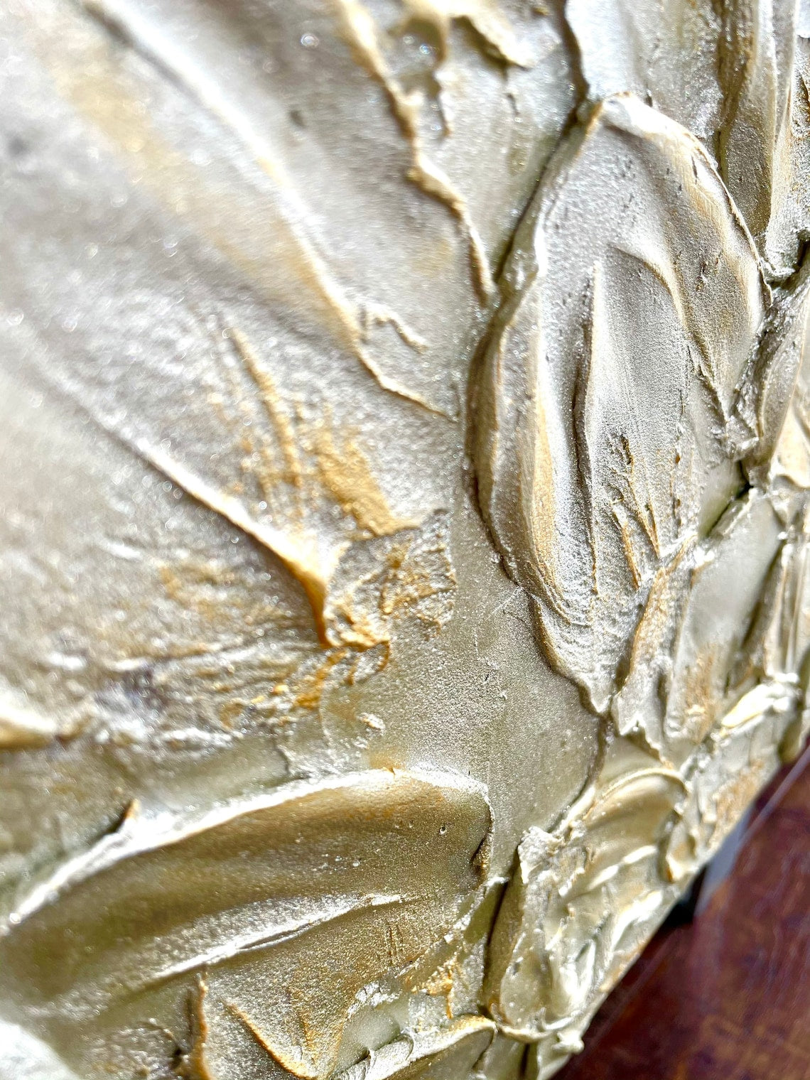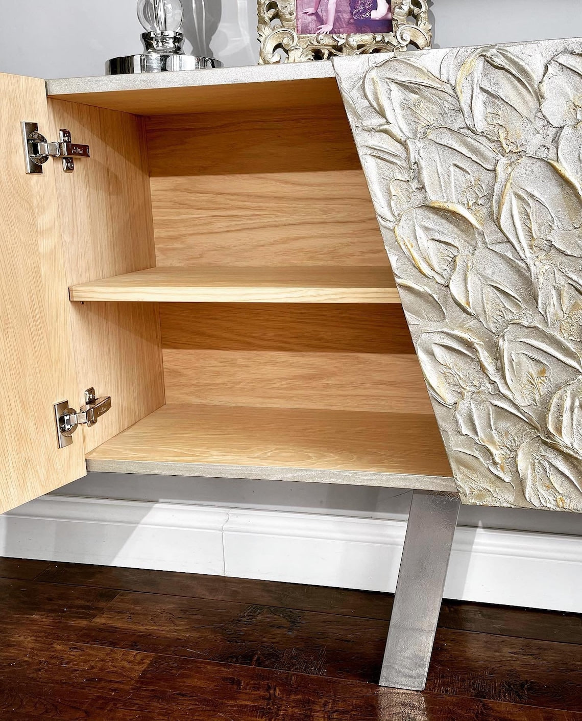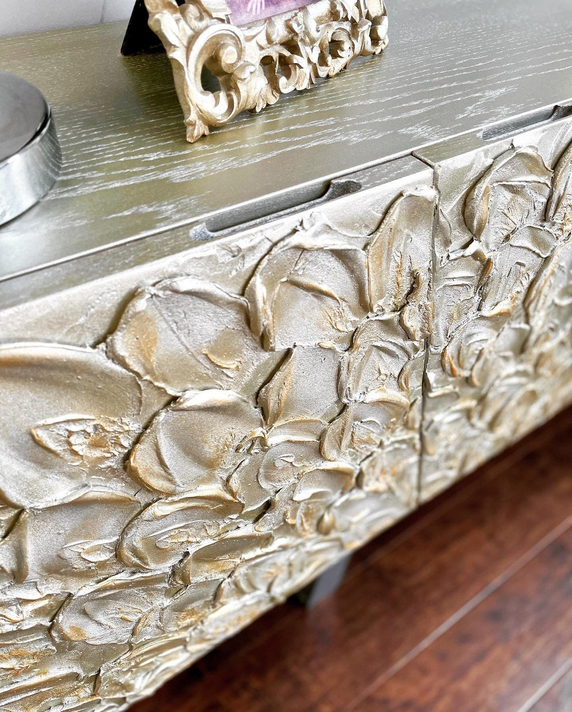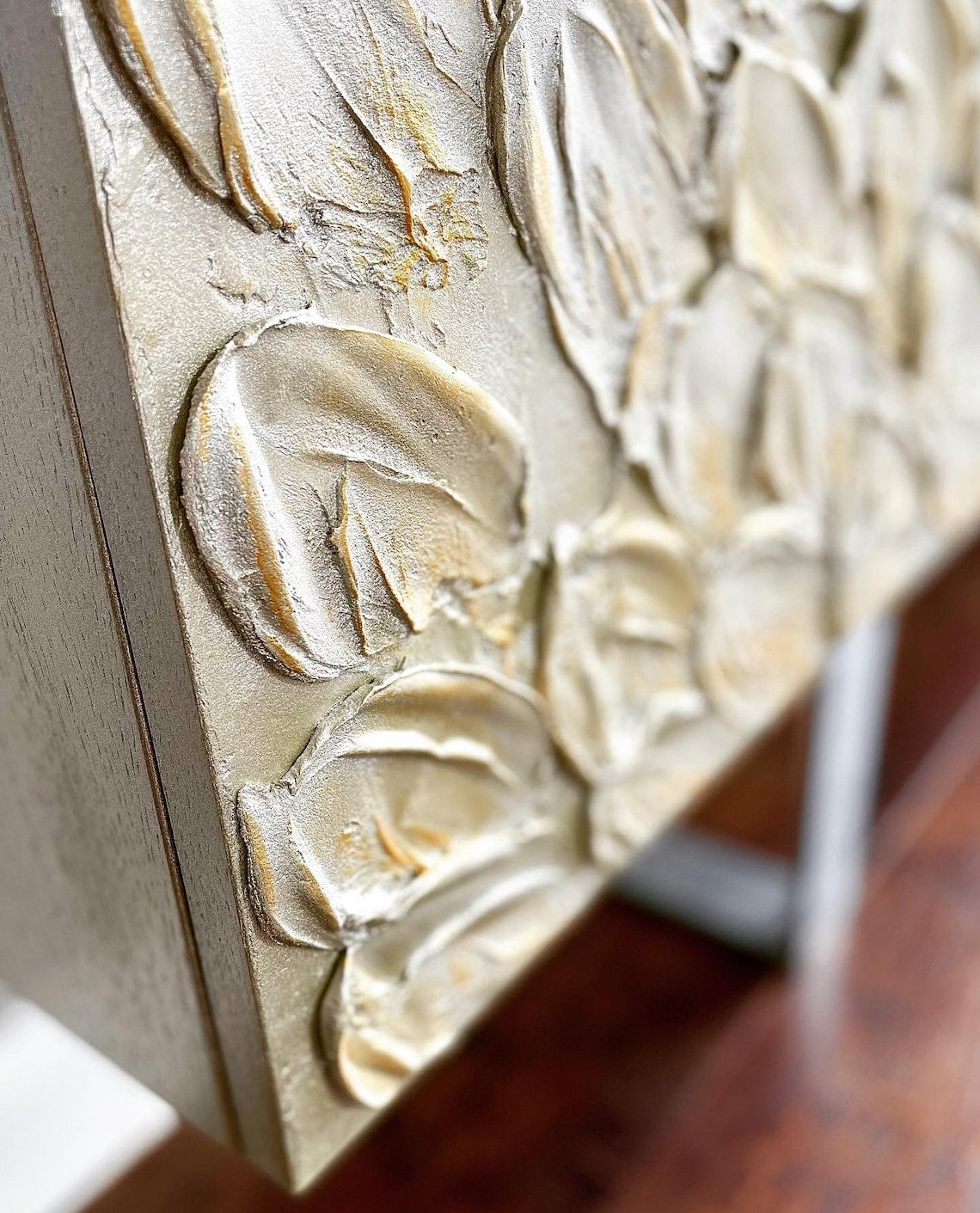 Its surface is hand-carved with delicate petal motifs that create a gentle rhythm across the front—organic, textured, and quietly luxurious.
