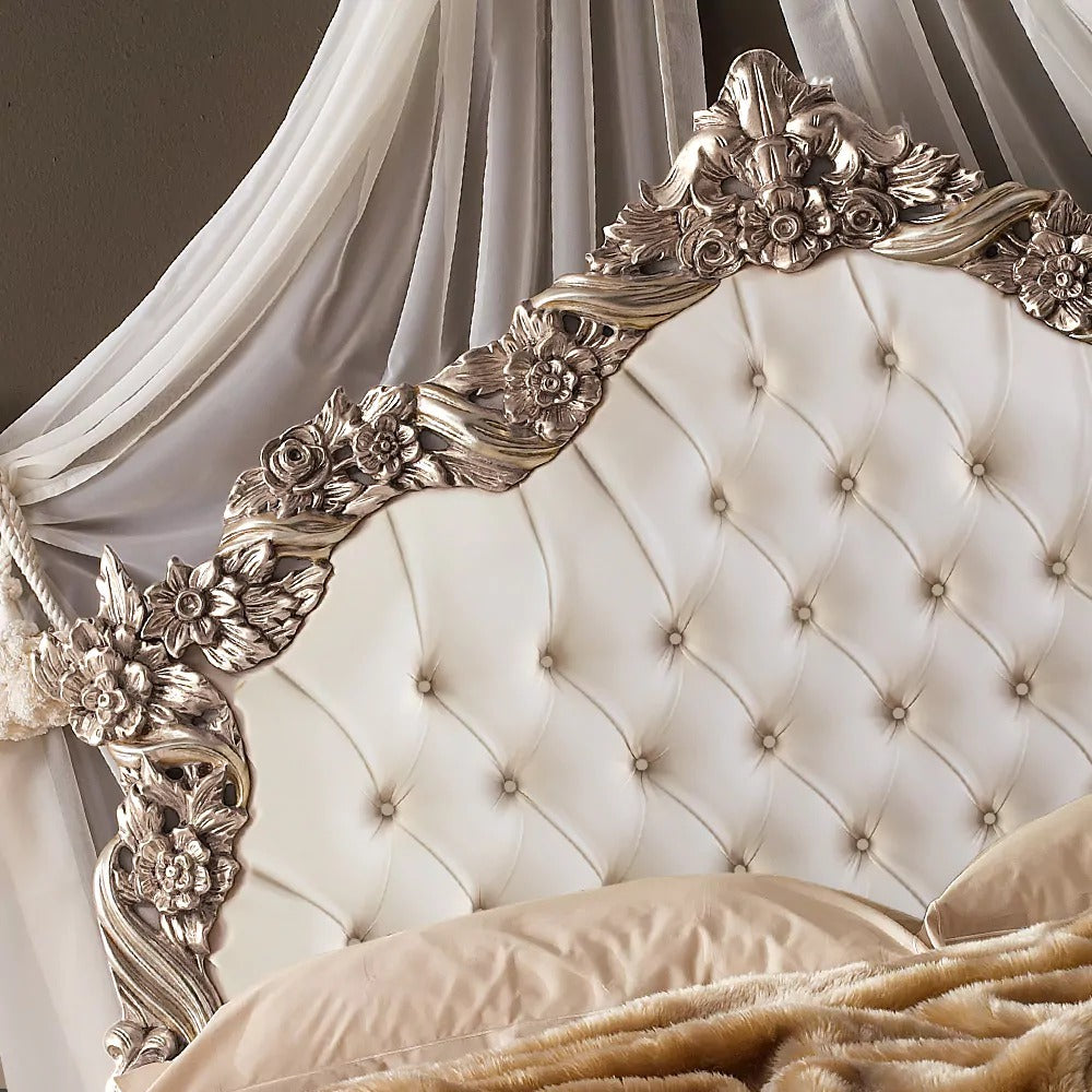 Reovia unfolds in white radiance, its tufted leatherette back rising with poise against the sweep of silver carvings.
