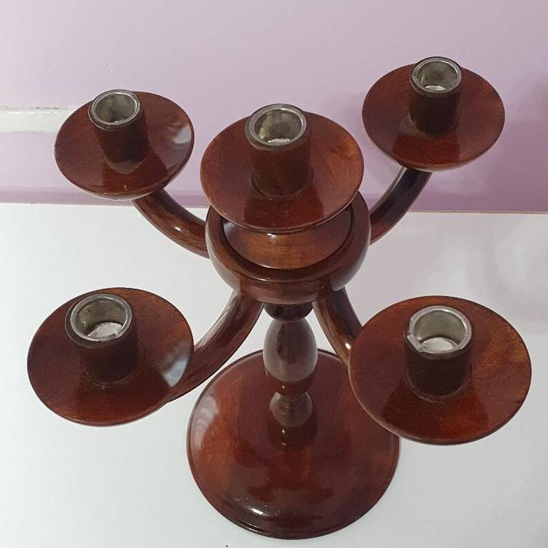 With five poised arms that arc like an opera singer’s gesture, this 12" high wooden candelabra is not a piece, it is a proclamation. Of candlelight. Of character. Of old-world seduction, polished into modern gloss.