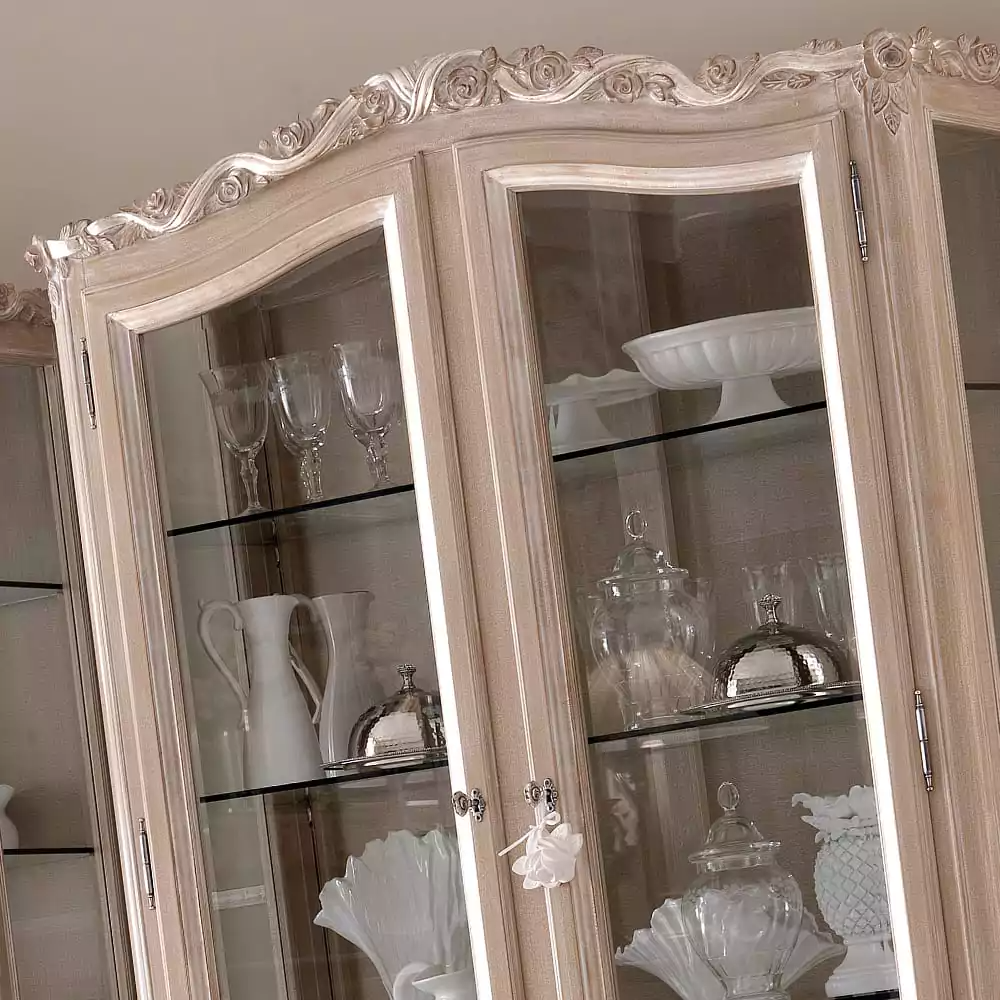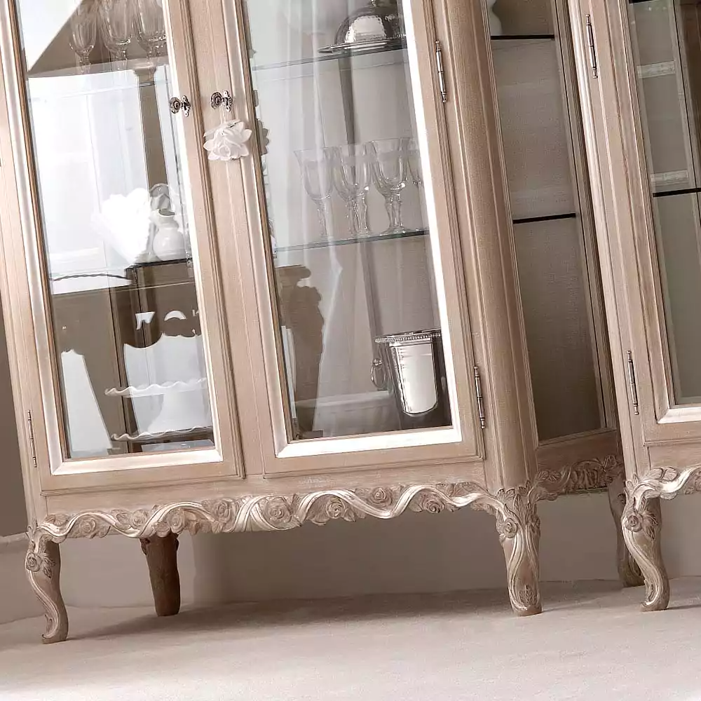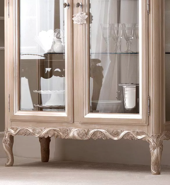 Carvings of roses and curling vines sweep along her crown and base—tendrils frozen mid-bloom, like lace etched in wood.