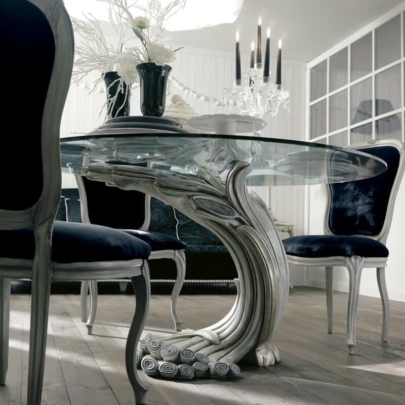 The table lives mid-motion, as if it might unfurl again at dusk. Around her, velvet chairs lean in as confidantes, silver-legged and silent.