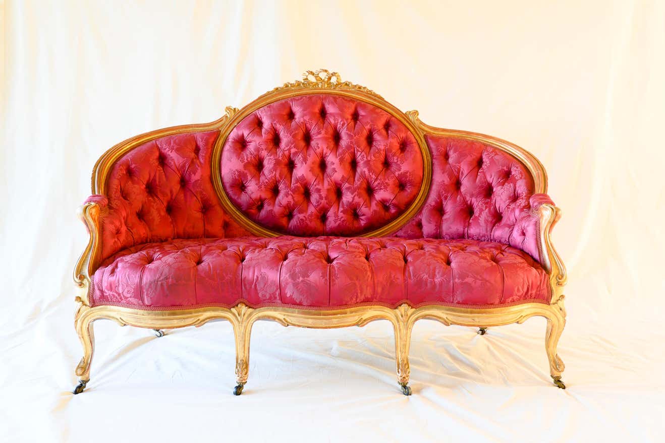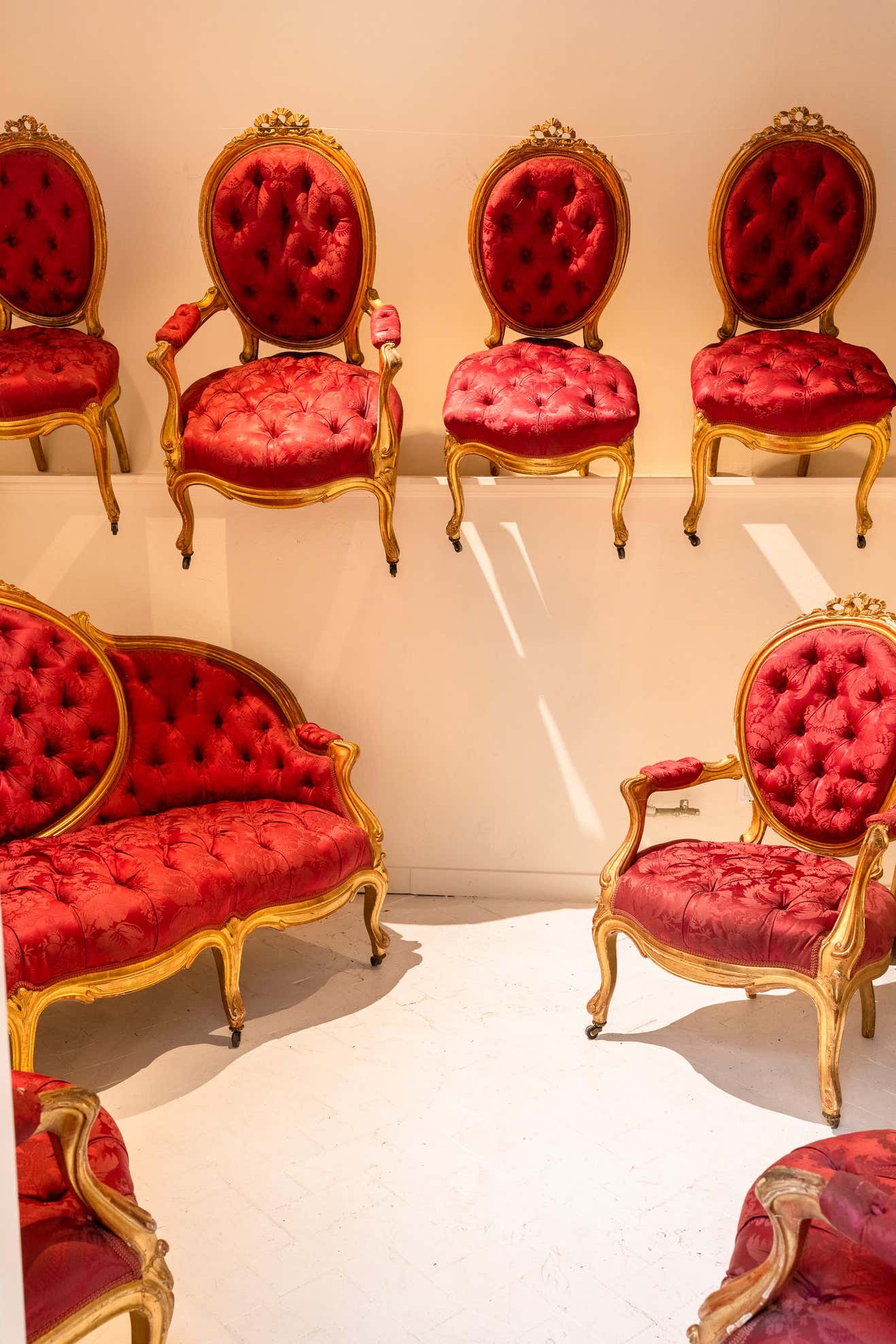 Rouge Doré wears its opulence in restraint—gilded curves meet deep scarlet suede in a composition as bold as it is regal. Every buttoned tuft holds court, every silhouette bows to the quiet command of craftsmanship.